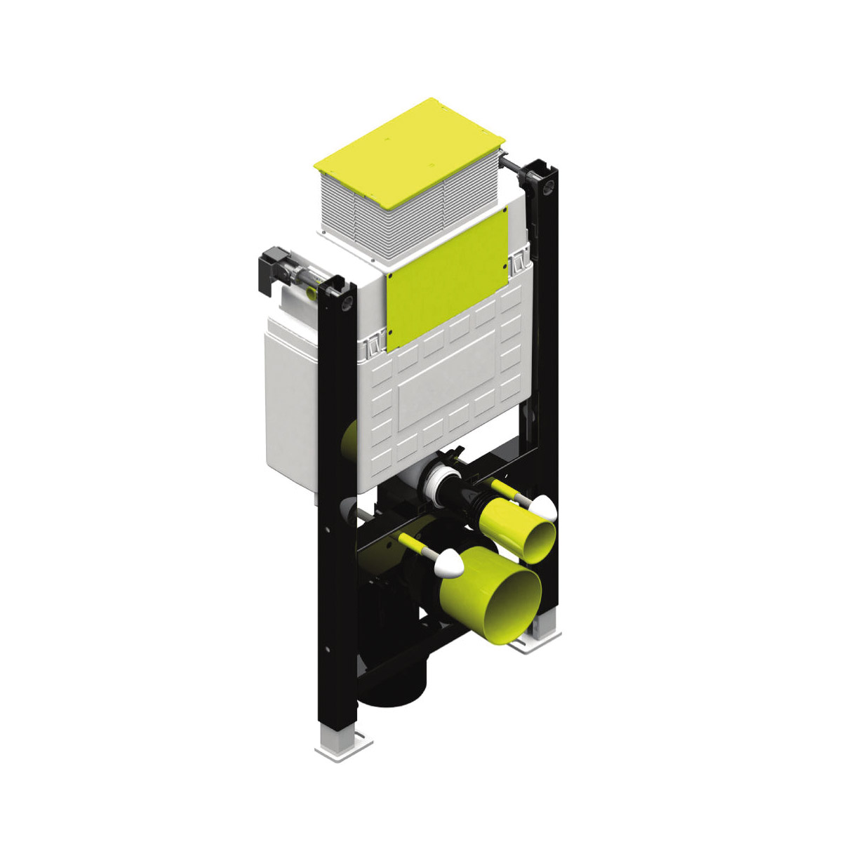 Τα νέα εντοιχισμένα καζανάκια είναι πλήρως μονωμένα με διογκωμένη πολυστερίνη. Αυτή η μόνωση βοηθά το εντοιχισμένο καζανάκι να αποκτήσει εξαιρετική αντίσταση στην κρούση και διπλή μείωση της στάθμης θορύβου. Ο όγκος του νερού είναι 6lt μέγιστο. Η δεξαμενή είναι εξοπλισμένη με ορειχάλκινη διπλή βαλβίδα εκκένωσης. Οι όγκοι έκπλυσης μπορούν να ρυθμιστούν 3lt ή 6lt. Η πλακέτα χειρισμού δεν περιλαμβάνετε στο σετ του καζανακίου. Όλα τα μοντέλα συνοδεύονται με συστολή 100/90 η οποία επιτρέπει την μετατροπή της αποχέτευσης από Ø100 σε Ø90 καθώς και ρυθμιζόμενες ντίζες στήριξης της λεκάνης που ρυθμίζονται για διάκεντρο 18cm ή 23cm. Το πλαίσιο των καζανακίων είναι ηλεκτροστατικά βαμμένο με αποξειδική βαφή, ενώ οι βάσεις ρύθμισης του ύψους είναι γαλβάνιζέ. Το μέγιστο φορτίο ανάρτησης είναι 400Kg.